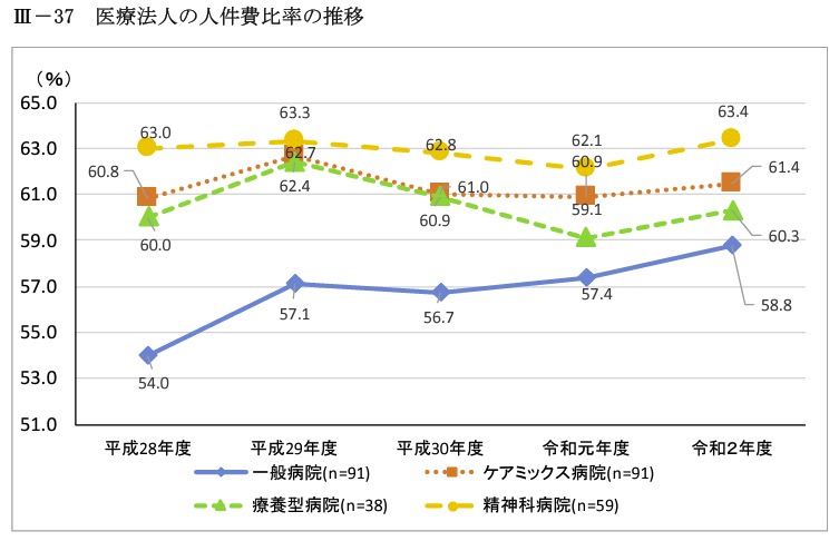 一般病院の人件費率は58.8%で、これは前年比+1.4%という結果。